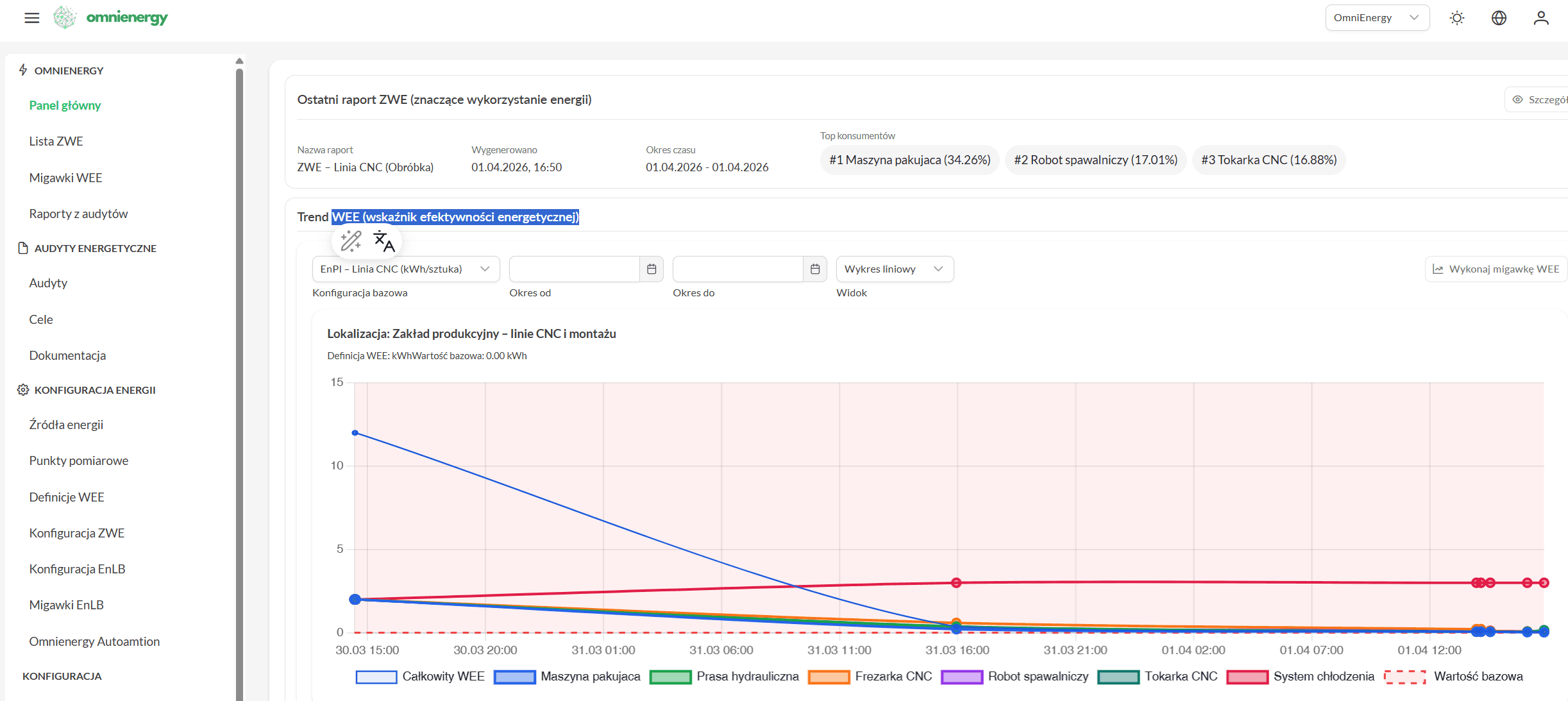 W OmniEnergy znajdziesz audyty energetyczne prowadzone krok po kroku z automatycznym podsumowaniem wyników, analizę kluczowych wskaźników ZWE (znaczące wykorzystanie energii) czy też WEE (wskaźnik efektywności energetycznej), przejrzysty przegląd wyników i gotowych rekomendacji oraz nowoczesny interfejs zaprojektowany z myślą o pracy operacyjnej.